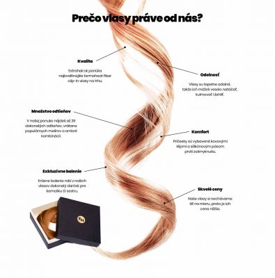 Získajte najkvalitnejšie termoheat fiber vlasy na trhu. Sada obsahuje 100% tepelne odolné clip in vlasy z umelých vlákien, ktoré viete kulmovať, natáčať alebo žehliť. Tento vlasový doplnok je vybavený kovovým klipom a silikónovým pásikom proti zošmyknutiu. Vďaka svojej dĺžke 70 cm vám umožnia vytvoriť dokonalé vlasové kreácie na ples, svadbu stužkovú.